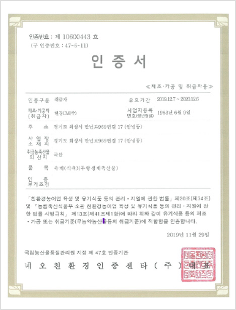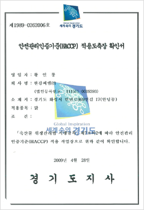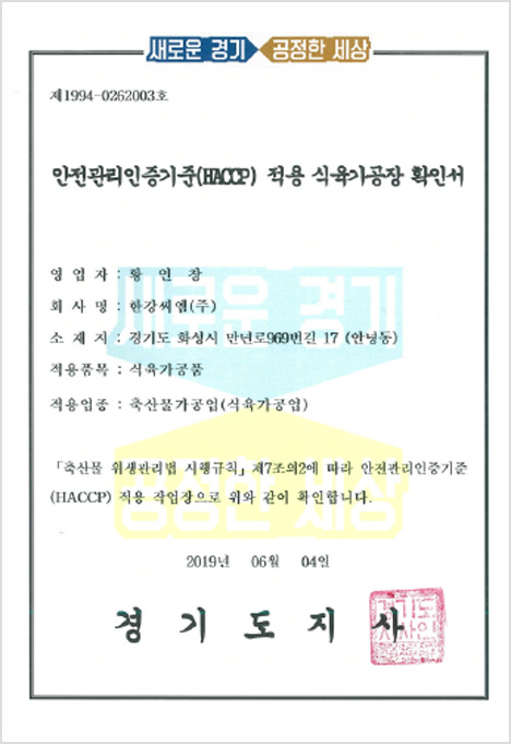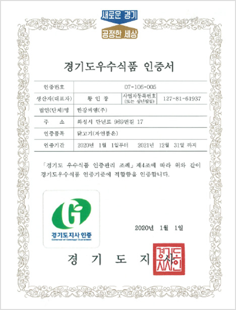 - 한강식품은 경기도 우수식품인증으로 지정 받아 소비자 신뢰를 높이고 품질을 인정받았습니다.